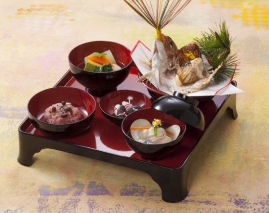 小鯛塩焼、吸物、煮物、赤飯、歯固め石