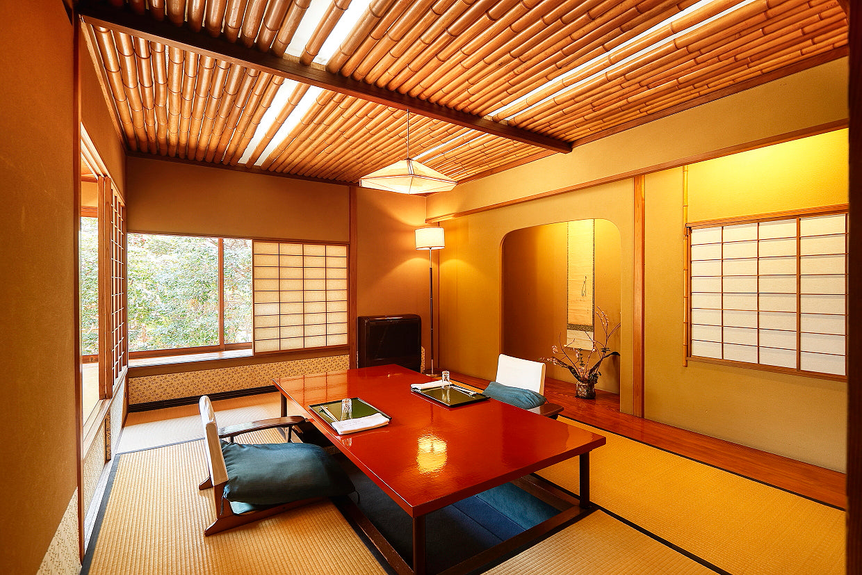 The light filtering in from the ceiling and the Japanese sliding doors, coupled by the view of the bamboo forest reflects modern Japan. Also ideal for use as a tea room.