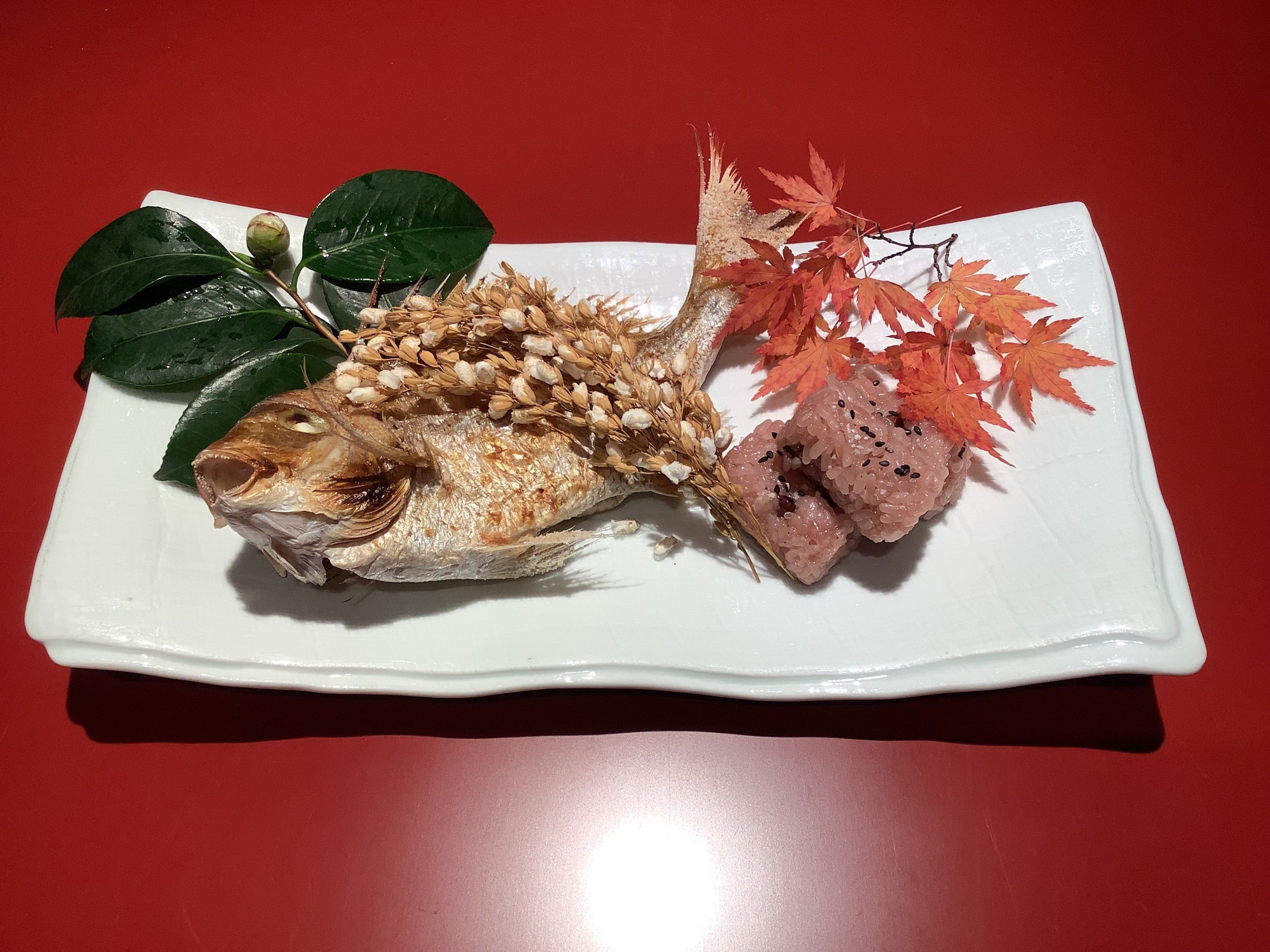 Sticky rice with red beans, clear soup, simmered dish, delicacy, grilled small sea bream