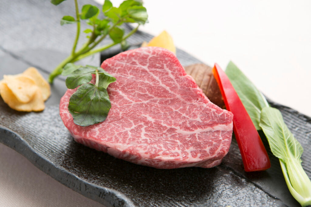 Appetizer, side dish, grilled vegetables, seafood, salad, Japanese beef Filet steak 80g, rice or garlic fried rice, miso soup, pickles, dessert and coffee or tea