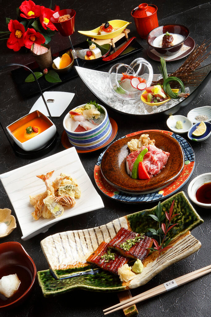 Appetizer, Assorted sashimi, Hot dish, Miyakonojo Wagyu beef sirloin steak, Grilled 2 kinds of eel on the steamed rice, pickled vegetable, miso soup and Dessert