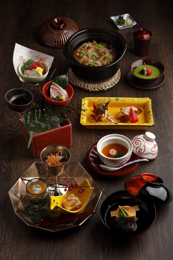Appetizer, Clear soup, Sashimi, Hot dish, Grilled dish, Rice, pickled vegetable, miso soup and Dessert