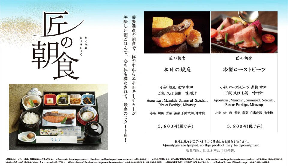 At Nadaman, the "Takumi Breakfast" is a lavish selection of dishes that embody the very essence of Japanese cuisine. With a choice of main dishes to suit your mood, this meal elevates your morning dining experience into a truly rich and special occasion.