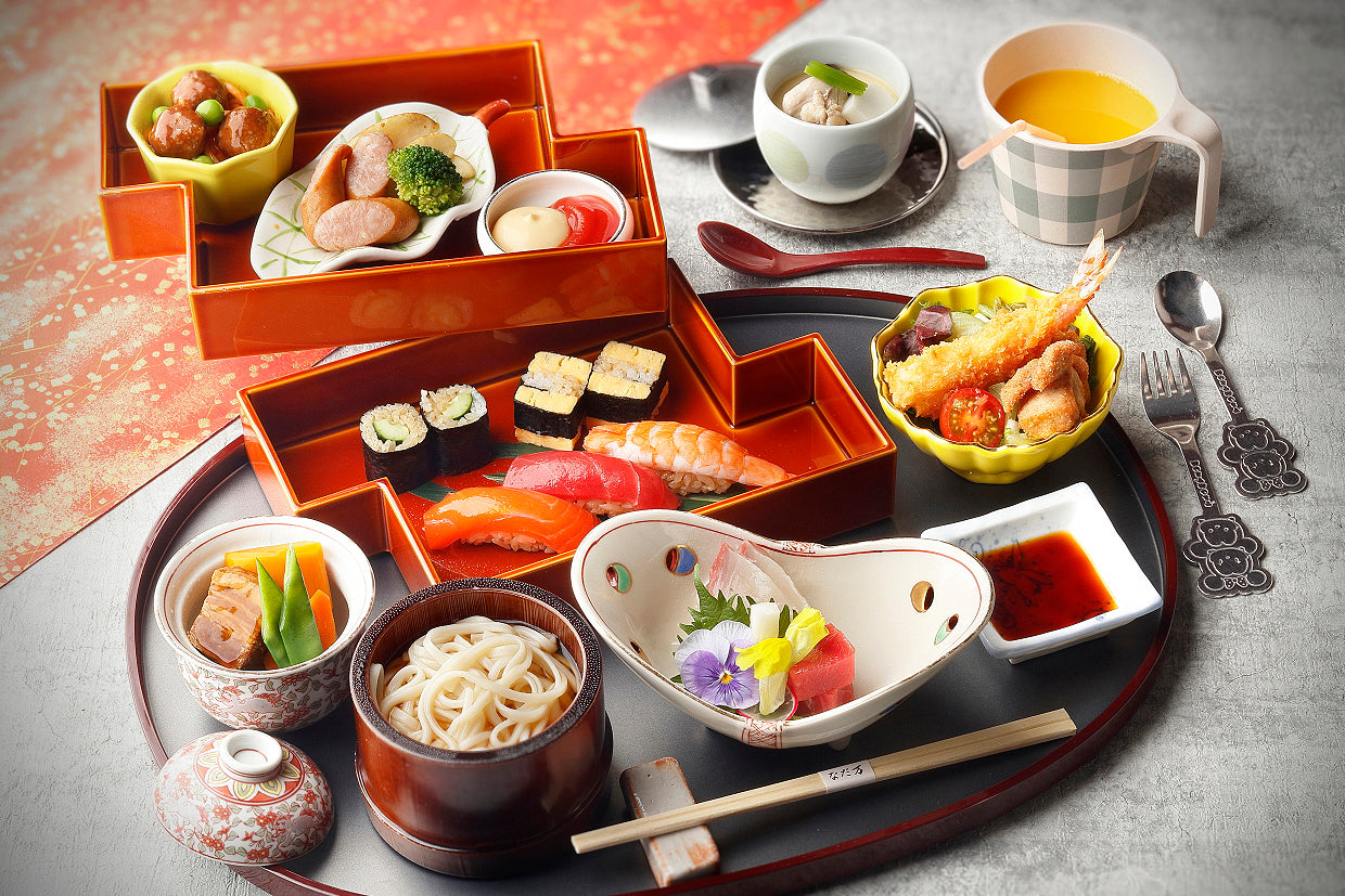 Steamed egg custard, sashimi, simmered dish, deep fried shrimp, Japanese fried chicken, meatballs, Vienna sausage, udon noodle, dessert