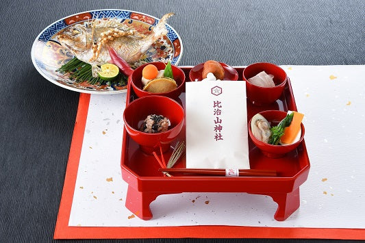 料理、小鯛姿焼、名前入り記念箸、比治山神社御祈祷の歯固めの石付