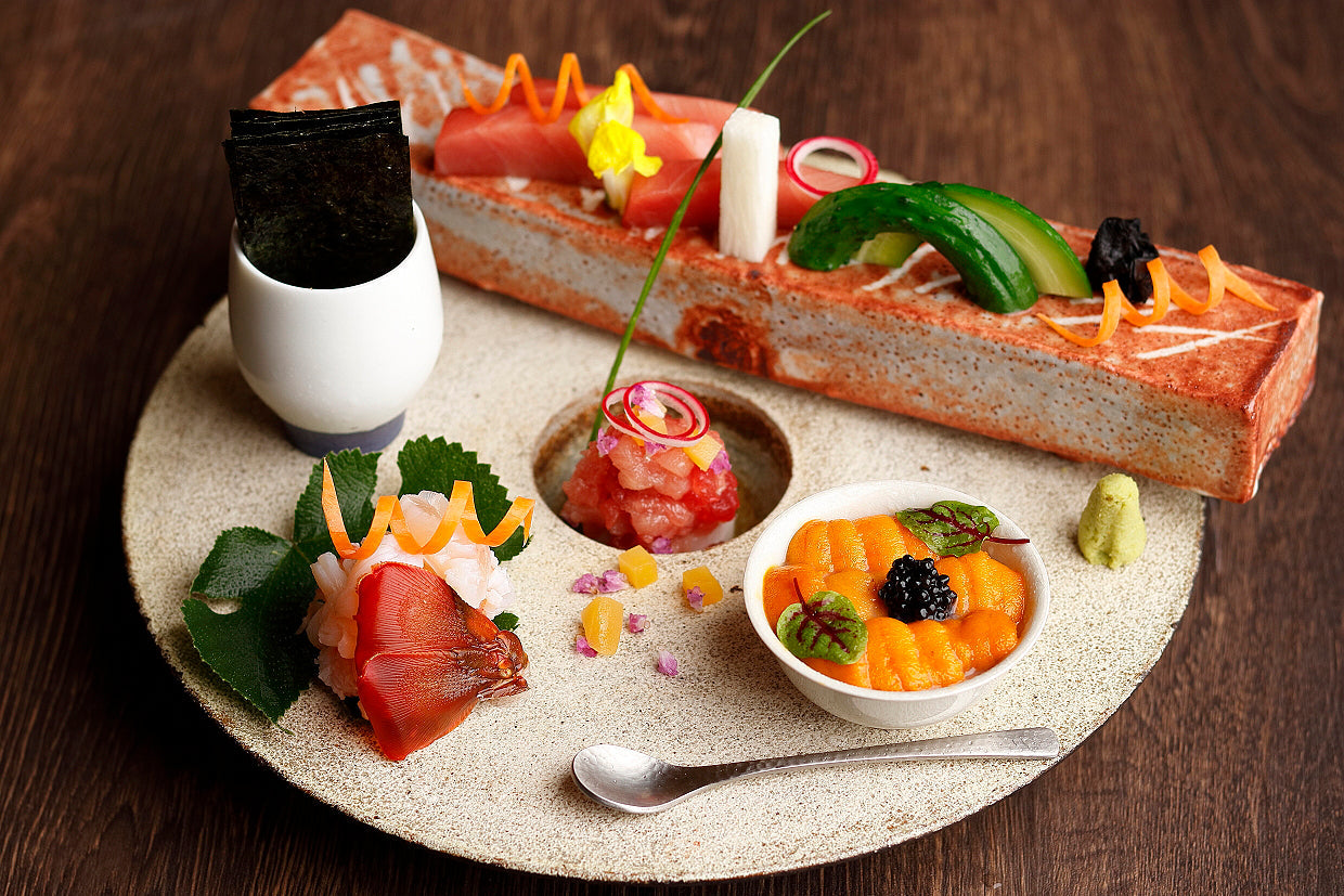 先付、造り、サラダ、天婦羅盛り合わせ、御飯、香の物、お椀、デザート