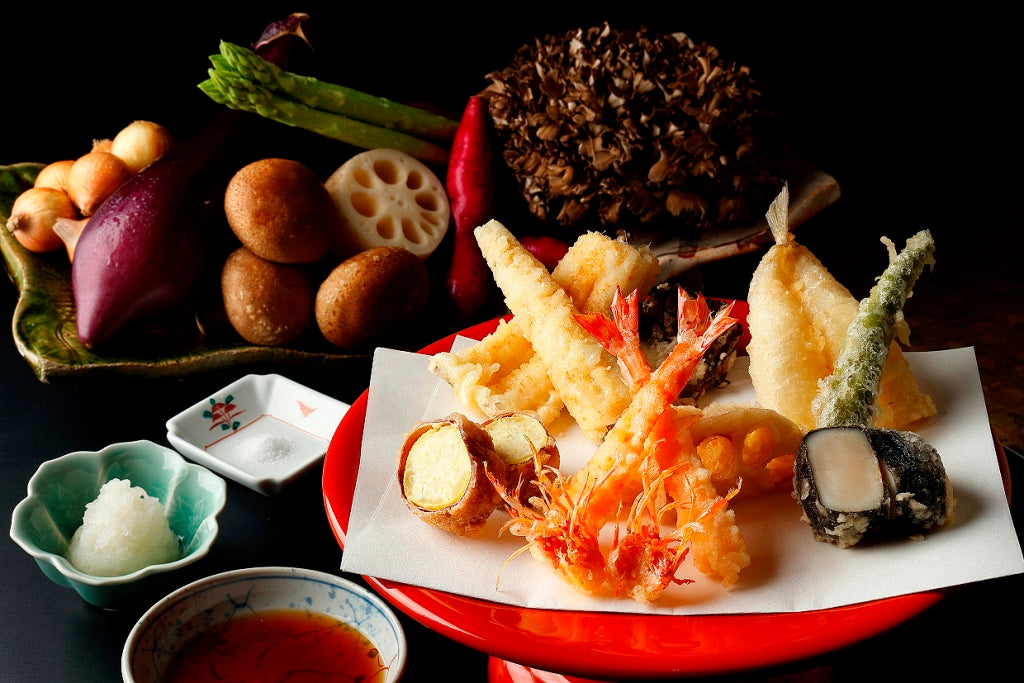 先付、造り、サラダ、天婦羅盛り合わせ、御飯、香の物、お椀、デザート