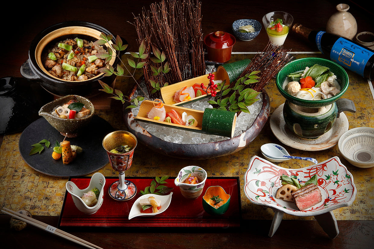 先付、造り、焼物、煮物、合肴、食事、止椀、香の物、デザート