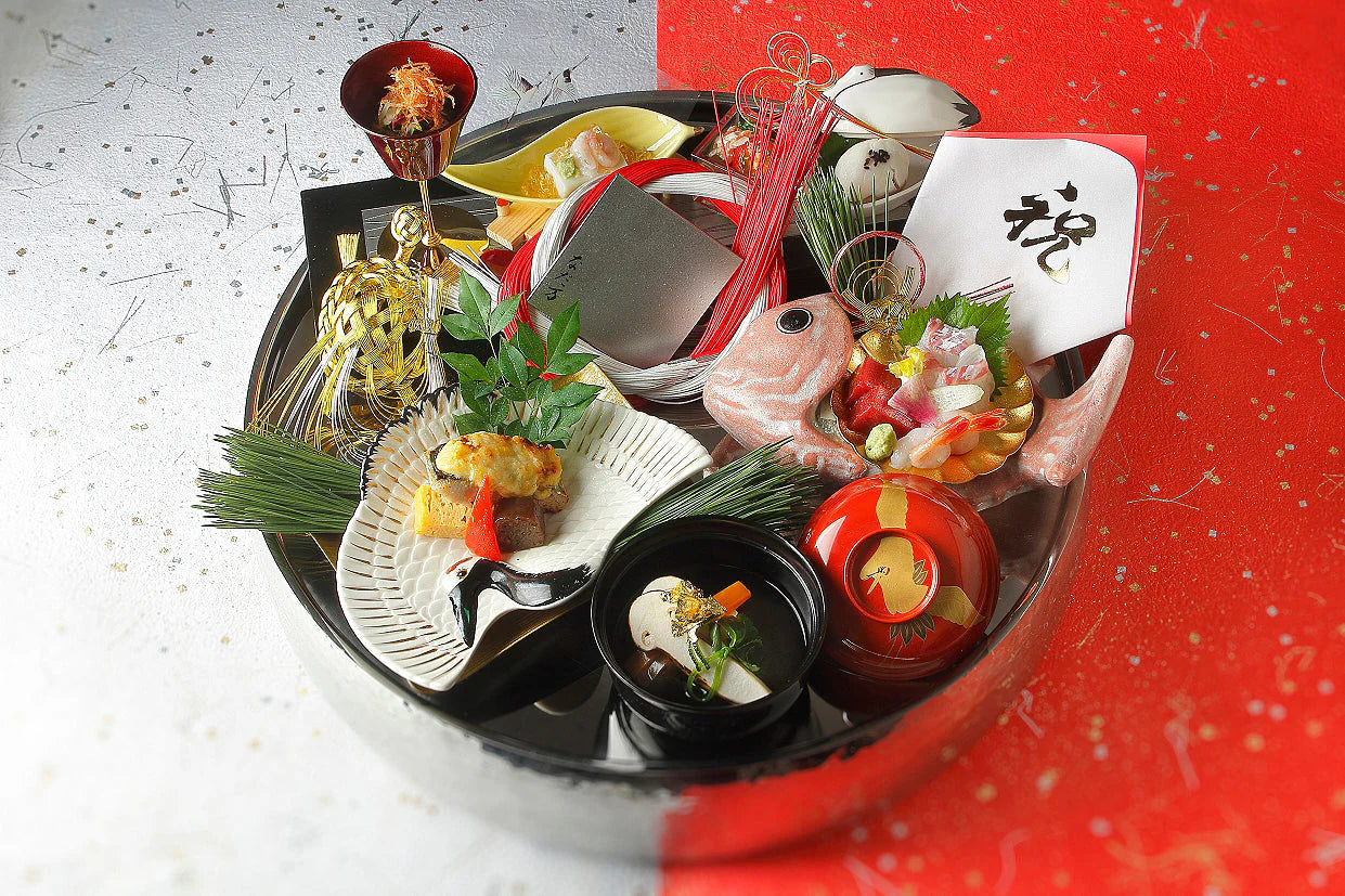 祝肴、吸物、造り(伊勢海老姿造り)、温物、焼物(鯛姿焼、鯛赤飯)、食事、デザート