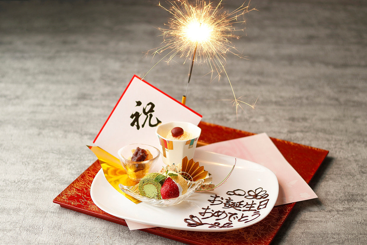 かわいいデザート盛合せをお祝いのメッセージを添えたプレートと共に