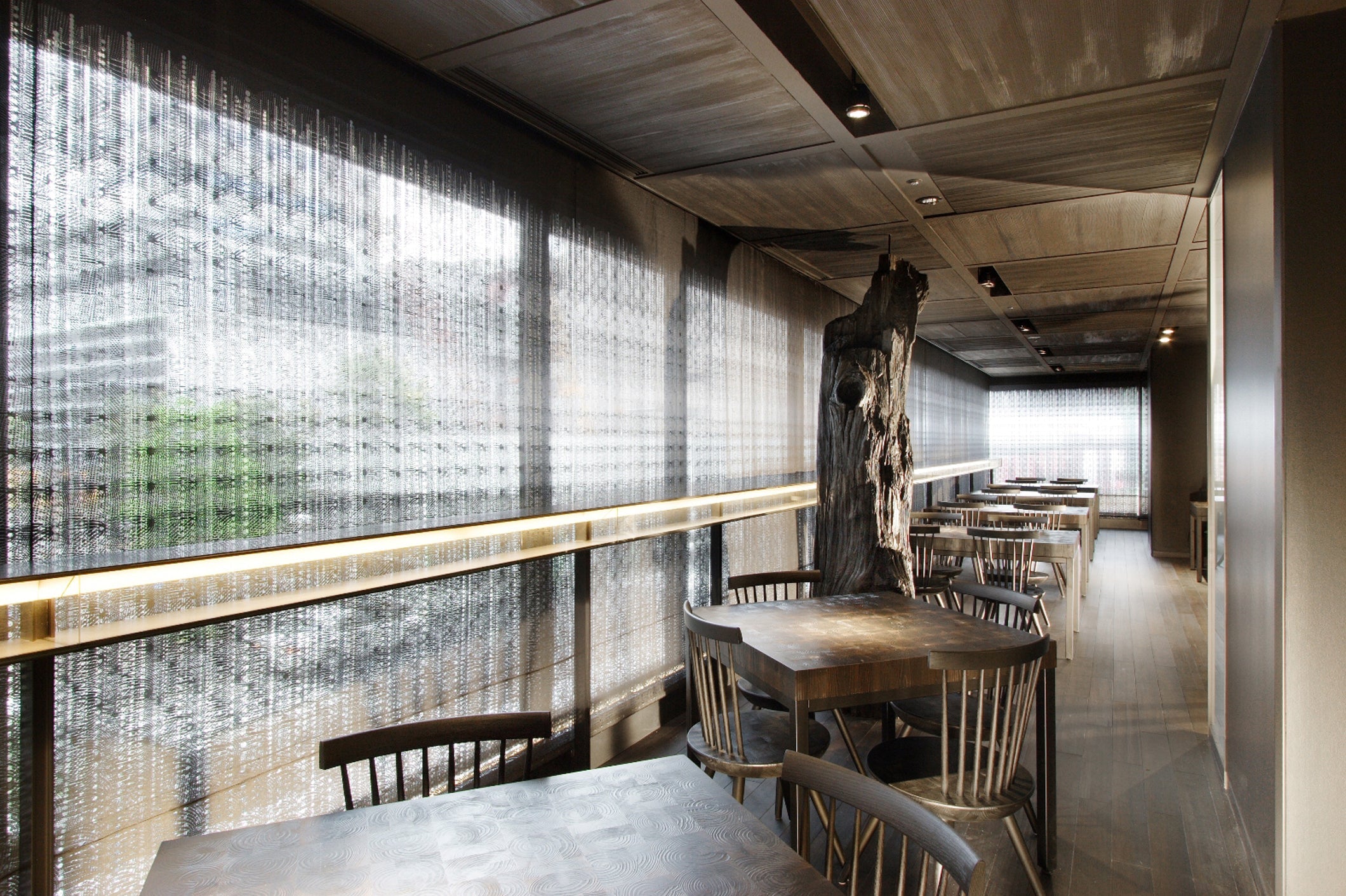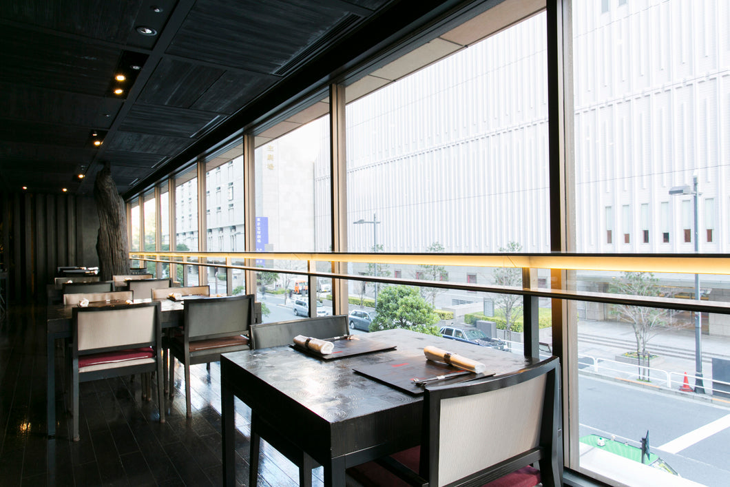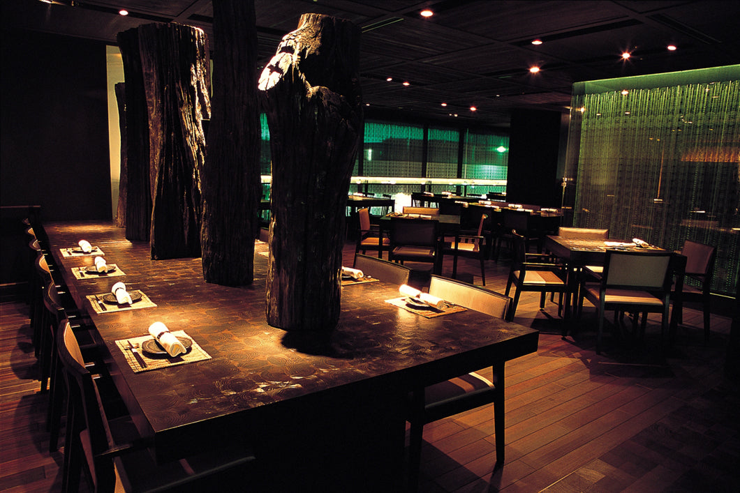 大きな窓に面した、開放感のある店内には、「炭」と「杉」をテーマにした、何千年もの時を重ねた埋木(うもれぎ)のオブジェを配した、年輪を重ねた大人に相応しい、落ち着いた空間。