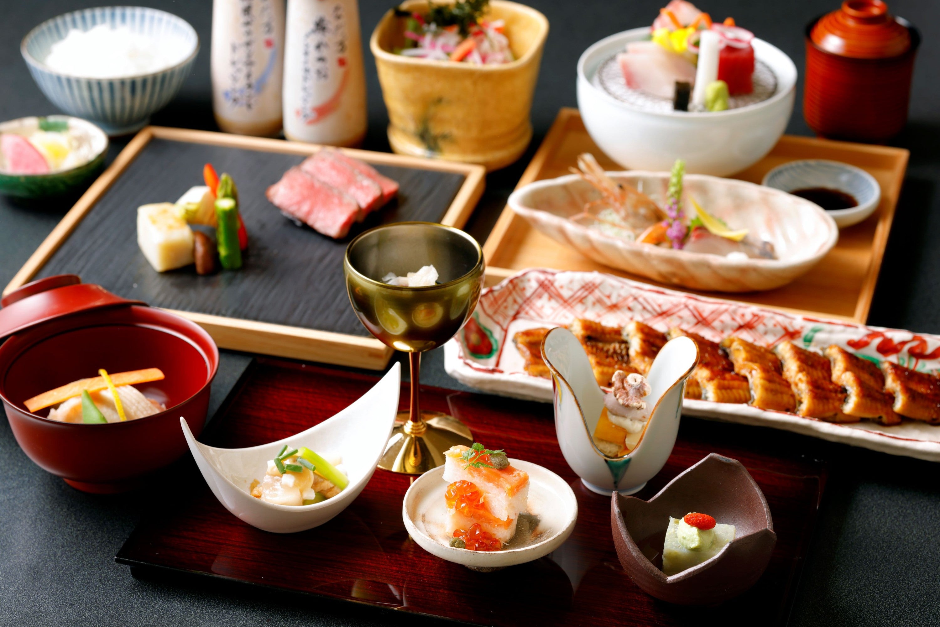 旬菜、温菜、造り、メイン(チョイス ①和牛すき焼 ②和牛ステーキ ③天婦羅盛り合せ ④鰻の蒲焼)、食事、デザート