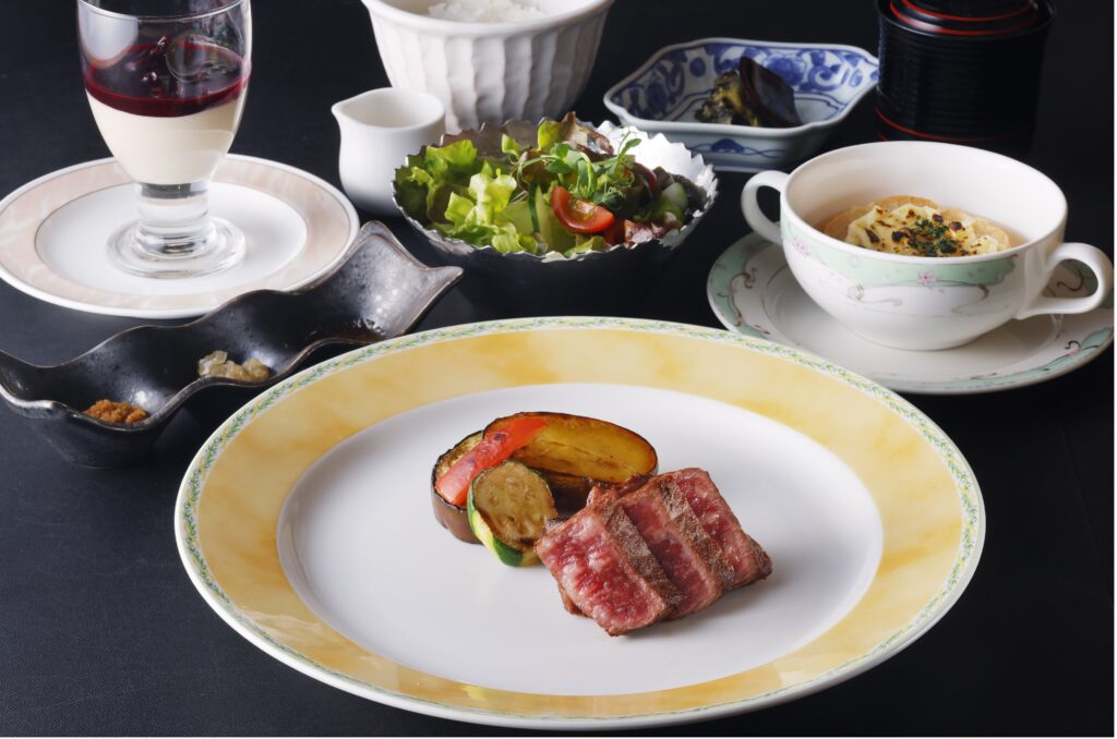 先付、温菜、サラダ、ステーキ、食事、デザート