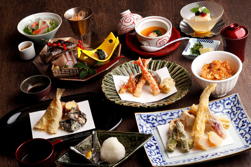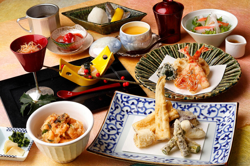 先付三種、温物、サラダ、天婦羅(活車海老2本、野菜4種、魚介4種)、掻き揚げ、食事、デザート