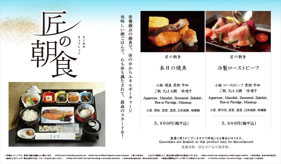 4種小鉢盛り、煮物、中皿、メイン(焼魚 又は ローストビーフ)、御飯(白米 又は お粥)香の物 味噌汁 Takumi Breakfast/¥5,800-----------------------------------Four assorted small sidedishes,Grilled fish or roasted beef,Simmered dish,Medium-sized plate (main dish),Rice or congee soup,Pickled vegetables,Miso soup