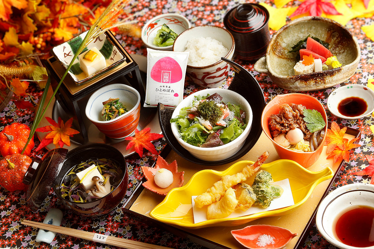 先付、吸物、造り、御膳 (博多和牛すき焼風・天婦羅盛り合せ・会津水耕健康サラダ) 、白御飯、香の物、止椀