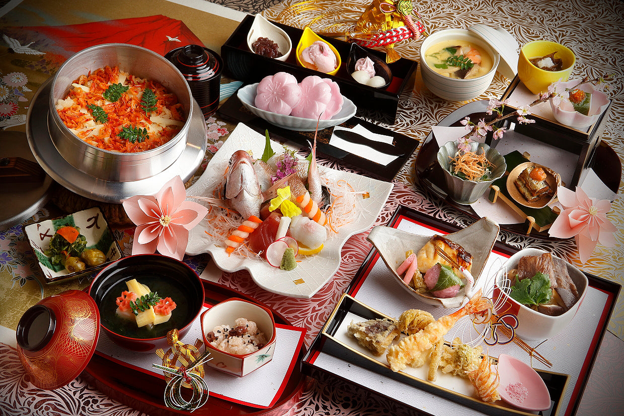 祝菜、お椀、赤飯、祝い鯛姿盛り、七宝蒸し、祝膳、季節の釜炊き御飯、香の物、留椀、デザート