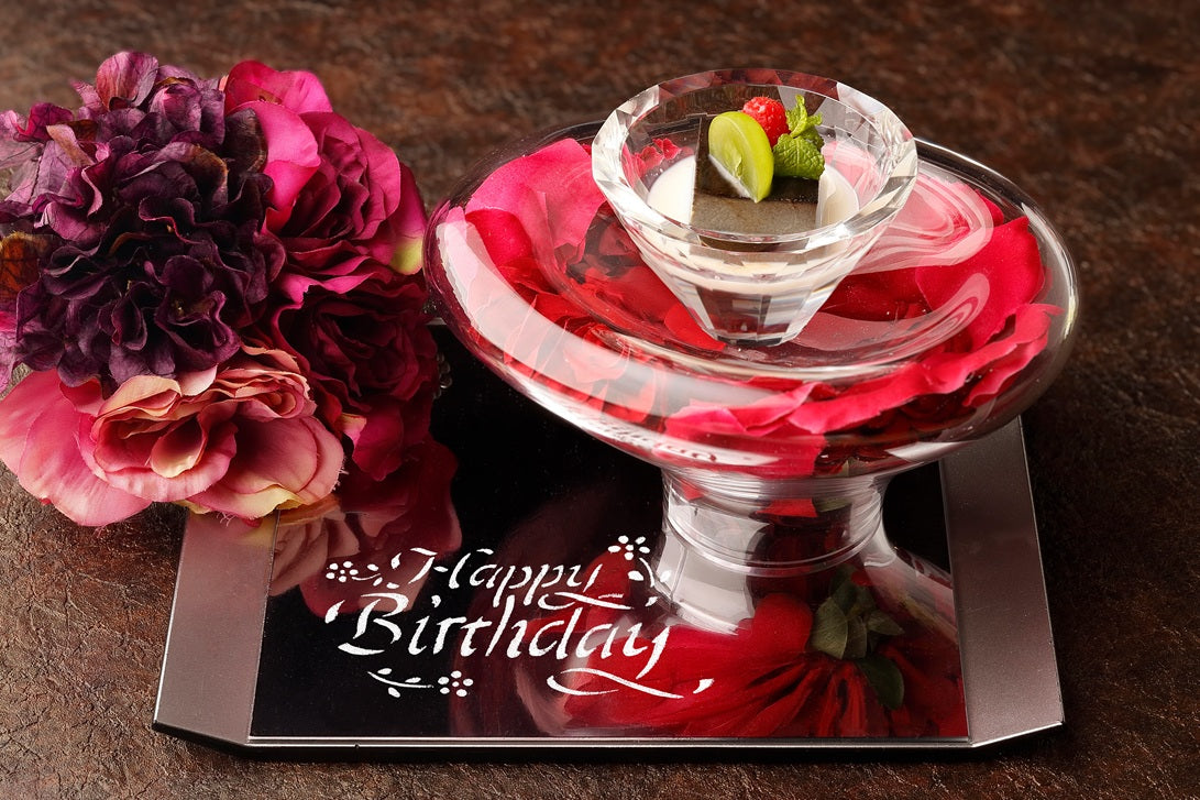 乾杯ドリンク(スパークリングワインまたはソフトドリンク、料理4品、料理長からのお祝いの1品、食事、デザート)