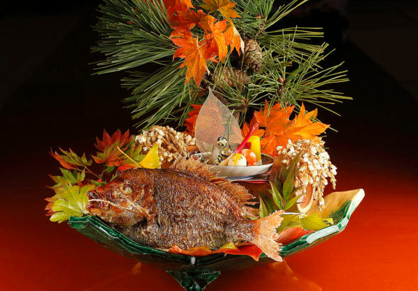 Sticky rice with red beans, clear soup, simmered dish, stone, whole grilled sea bream