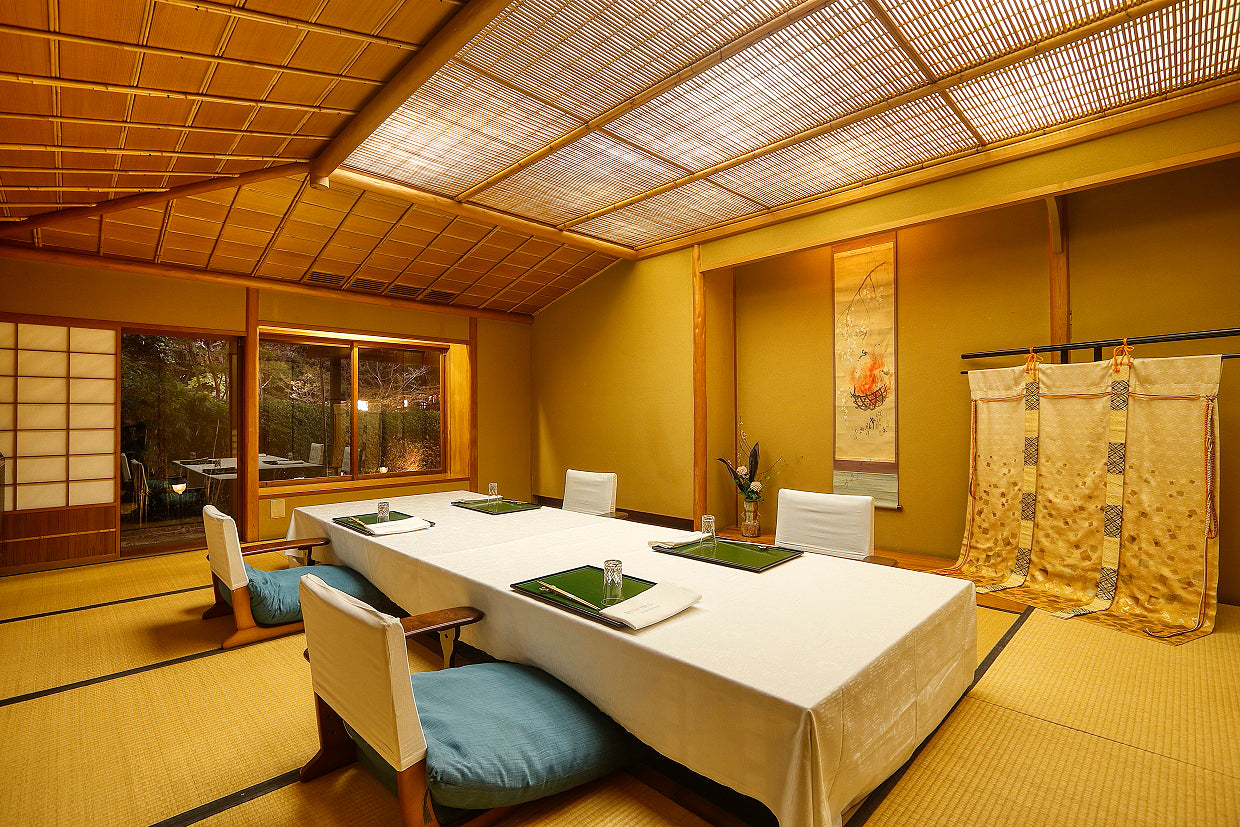 柔らかな光を透かす和紙張りの光天井。金糸銀糸を織り込んだ水衣の襖。庭先まで張り出した軒が、静けさと落ち着きを感じさせます。東京サミット/1986年の東京サミットでは中曽根首相の公式晩さん会が山茶花荘にて催されました。