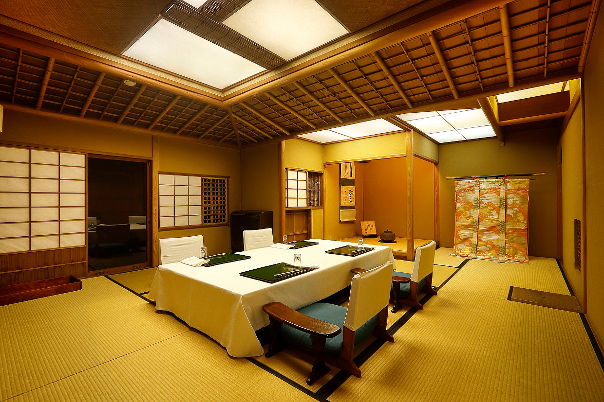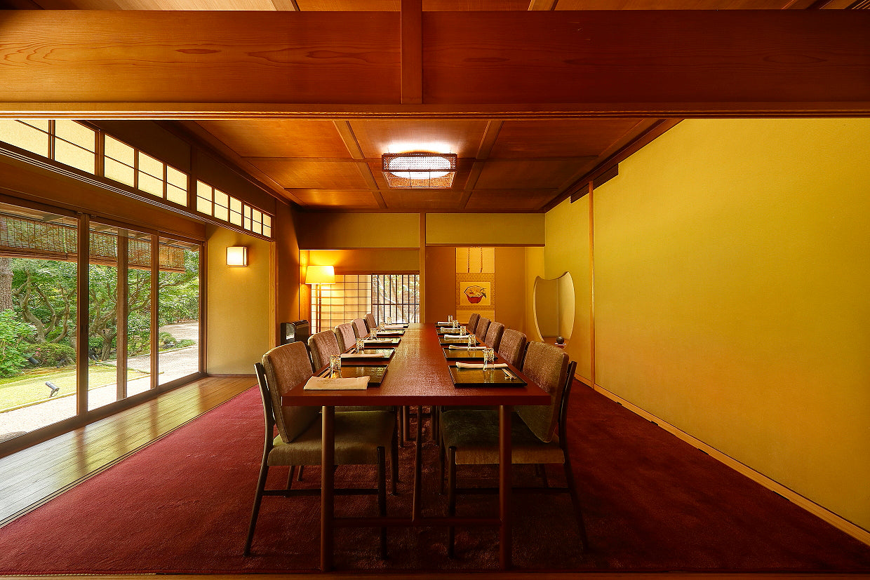 2025年テーブル・椅子席にリニューアルしました。天板が朱の漆塗りのテーブルに、貴重な国産広葉樹ブナ材を使用した椅子。軽量さや快適さなど幅広い方々に使い心地のよいデザインがされています。正面のシンプルな床と対をなす、風雅な曲線の洞床と杉の一枚板を使った格天井、和の魅力あふれるお部屋です。